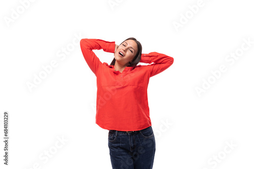 pretty young brunette business woman dressed in a red blouse on a white background with copy space