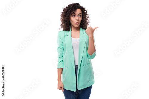 pretty young brunette curly businesswoman dressed in a blue jacket tells interesting news
