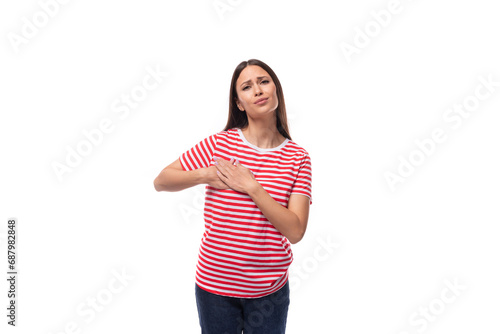 pretty young caucasian promoter woman with straight hair in glasses and in a striped red t-shirt on a white background with copy space