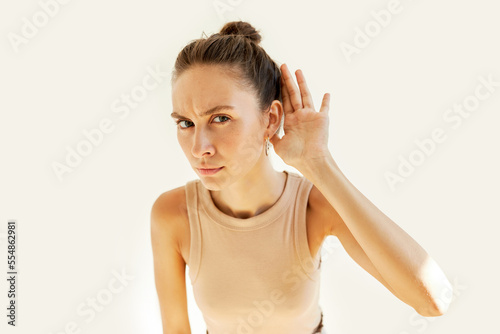 Pretty young girl eavesdropping, listening to rumors and gossips about herself attentively, frowning with tension, looking suspicious, putting left hand to ear, isolated on white studio background