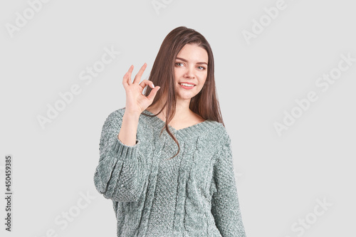 Pretty young woman gesture. Studio portrait. Female person. Home grey sweater. Isolated background. Ok sign. Caucasian people. Approve symbol. Business model