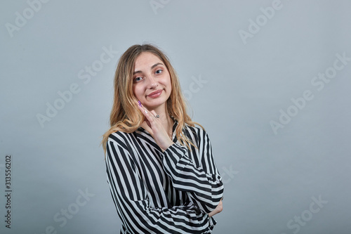 Pretty young woman in fashion black and white striped shirt looking at camera, keeping hand on cheek isolated on gray background in studio. People sincere emotions, lifestyle concept.