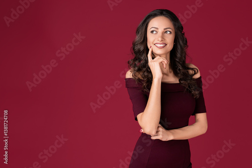 Pretty young woman with bright smile in maroon dress over red background. Looking to camera.