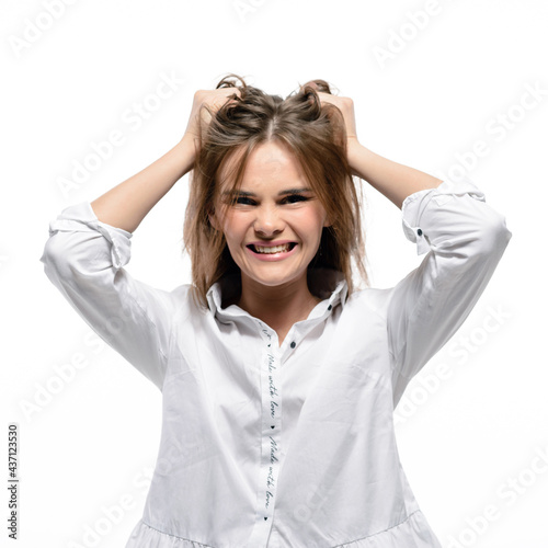 Problems, headache, stress and depression concept. Angry woman rips her hair