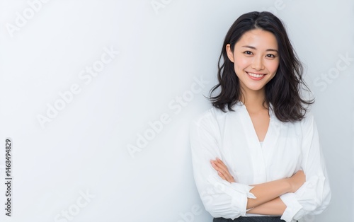 Professional Asian Businesswoman in White Shirt, Friendly Half-Body Portrait, Clean Backdrop, Natural Light, Corporate Elegance