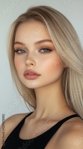 Professional beauty portrait showcasing flawless makeup application with soft peachy tones, highlighted cheekbones, and perfectly styled ash blonde hair against neutral background.