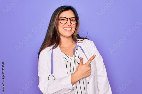 Professional doctor woman wearing stethoscope and medical coat over purple background cheerful with a smile of face pointing with hand and finger up to the side with happy and natural expression