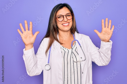 Professional doctor woman wearing stethoscope and medical coat over purple background showing and pointing up with fingers number ten while smiling confident and happy.