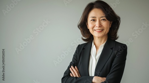 Professional Japanese Businesswoman Smiling, Arms Crossed Confidence in Corporate Setting Ideal for Business Design, Print, Card, Poster, Stock Photography