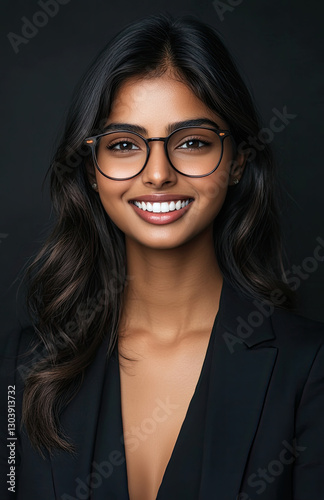 Professional portrait of a smiling woman in glasses wearing a black blazer against a dark background