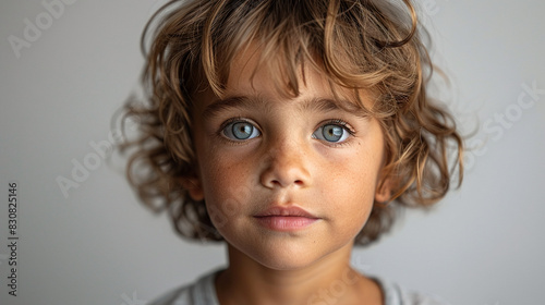 Professional studio photo portrait of a cute little boy, lovely kid with naive face, a child with a emotional expression, widescreen 16:9