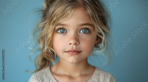 Professional studio photo portrait of a cute little girl, lovely kid with naive face, adorable baby, a child with a emotional expression, widescreen 16:9