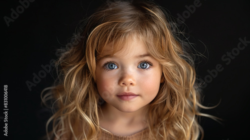 Professional studio photo portrait of a cute little girl, lovely kid with naive face, adorable baby, a child with a emotional expression, widescreen 16:9