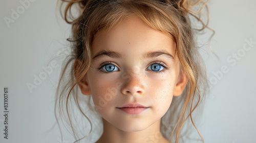 Professional studio photo portrait of a cute little girl, lovely kid with naive face, adorable baby, a child with a emotional expression, widescreen 16:9