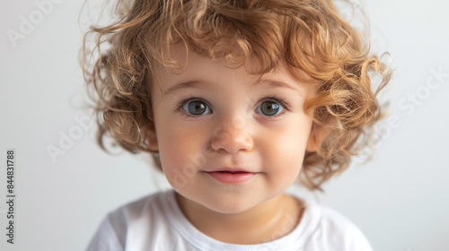 Professional studio portrait photo of a cute model boy with perfectly clean teeth, smiling on a white background.