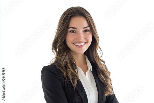 Professional woman smiling in a business suit. Confident and approachable corporate portrait on a white background.