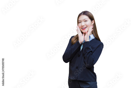 Professional young asian working woman who has long hair wears black formal suit with blue shirt while she smiling happily while isolated white background.