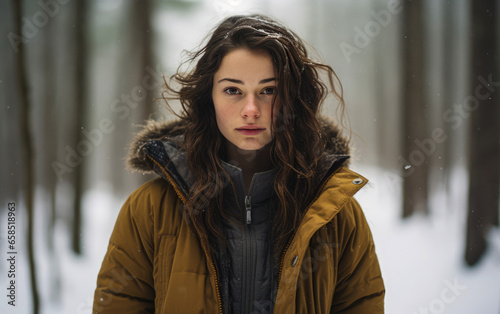 Profile of young beautiful woman warmed in wool sweater, cozy clothes and jacket during cold winter snowy day. A scarf and a cap are a necessary accessory on cold days.