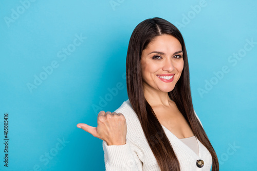 Profile photo of brunette cute young lady index empty space wear white pullover isolated on blue color background