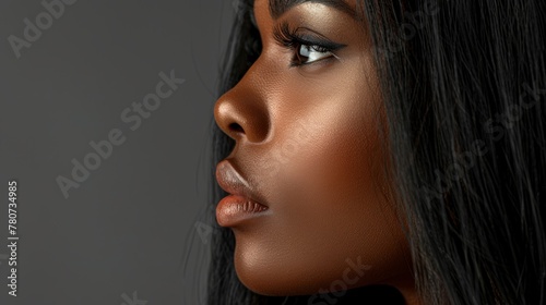 profile side of a woman face with a long black hair,, brown skin, isolated on a grey background.