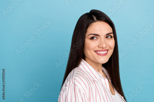 Profile side view portrait of attractive cheerful curious long-haired girl think copy space isolated over blue pastel color background