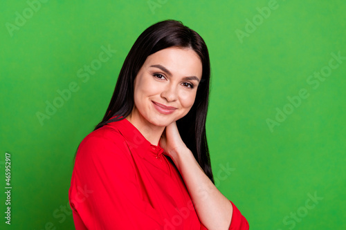 Profile side view portrait of attractive cheery lady posing good mood enjoying isolated over bright green color background