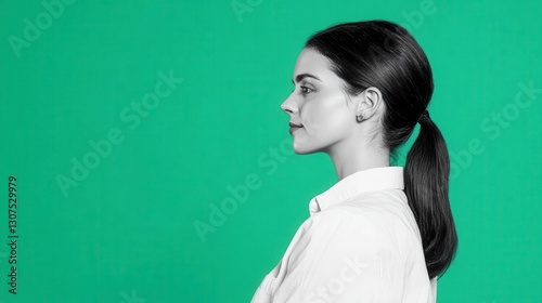 Profile view of a young woman with dark hair in a ponytail, wearing a white sweater against a solid green background. Monochrome portrait with a minimalist aesthetic.