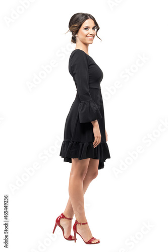 Profile view of happy smiling Hispanic woman in black flounce dress looking at camera. Full body length portrait isolated on white background.