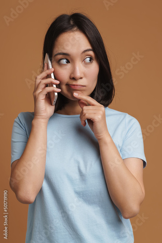 Puzzled asian woman wearing t-shirt talking on cellphone
