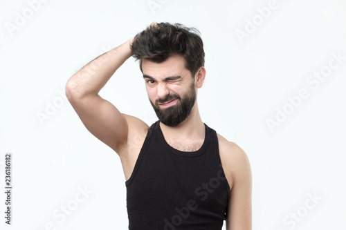 Puzzled hispanic man touches his head with his hand. as saying What I drunk on party yesterday