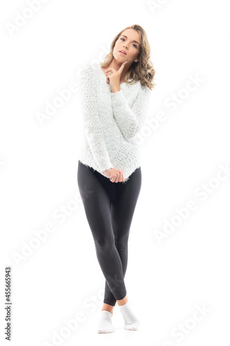 Puzzled young skeptical beauty in cozy home wear looking at camera with finger on cheek. Full-length portrait isolated on white background