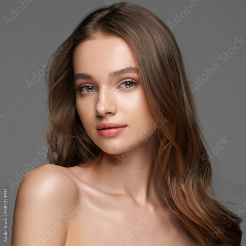 Radiant Beauty Portrait A Stunning Young Woman with Flawless Skin and Flowing Brown Hair Posing Against a Neutral Gray Backdrop in a Captivating Studio Shot