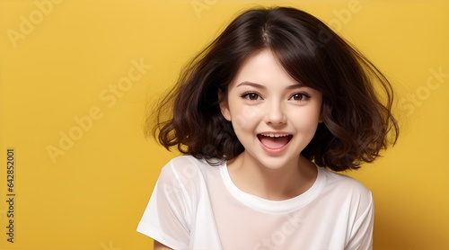 Radiant Joy: A portrait of a young woman with dark hair and a bright smile, radiating pure joy against a vibrant yellow background. The image captures a moment of pure happiness and youthful energy.