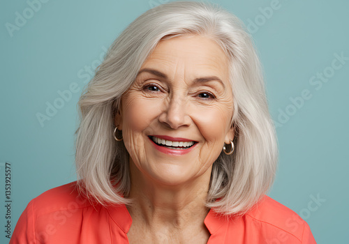 Radiant mature woman with gray hair smiles warmly, radiating joy and confidence against a bright blue backdrop.