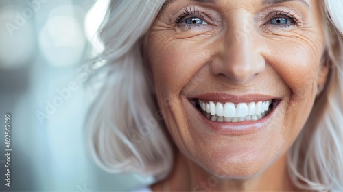 Radiant senior woman with bright smile close up background is clear and clean