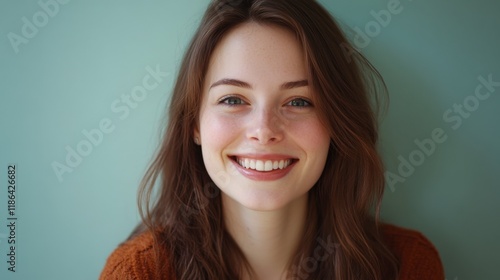 Radiant Smile: A close-up portrait of a young woman with long brown hair and sparkling blue eyes, radiating genuine happiness with a bright smile.
