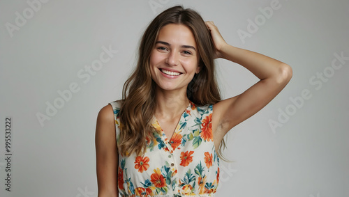 Radiant Smile, Casual Confidence: A young woman with long brown hair, radiates happiness in a floral summer dress, her genuine smile and relaxed pose exude positivity and charm.