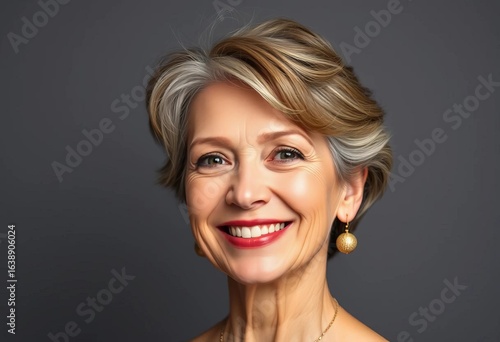 Radiant smile, confident gaze, mature elegance, serene expression, gray backdrop, joyful, dignity