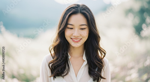 Radiant Smile: Portrait of an Asian Woman in Nature's Embrace, Serene Beauty, Joyful Expression, Soft Light, Elegant Simplicity