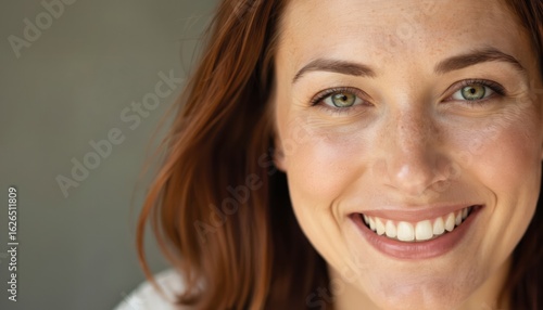Radiant woman with red hair and green eyes smiles on dark gray background. Mature woman face stands out against plain background. Smooth, youthful skin and confident expression.