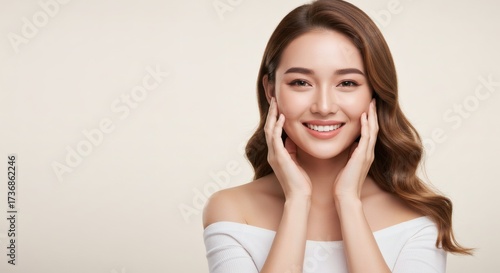 Radiant Young Woman with Flawless Skin, Gently Touching Her Face and Expressing Joy and Confidence, Symbolizing Natural Beauty and Skincare Well-being