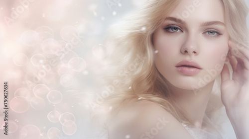 Radiant young woman with flawless skin smiles softly. Dreamy background blurs with sparkling bokeh. Perfect for web design, product showcases, cosmetics & skincare promotions.