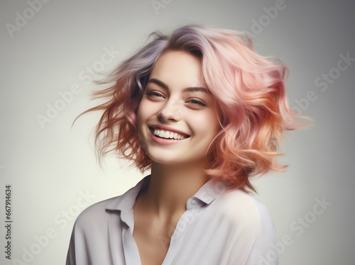 Radiant Young Woman with Vibrant Hair on Light Studio Backdrop. Generative ai