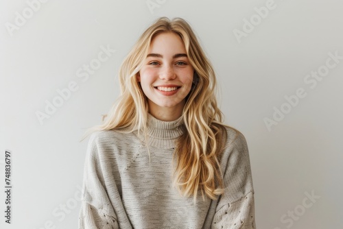 Radiating joy and humor, a university student girl stands before a pristine white background, perfectly capturing the spirit of youthful protagonists.