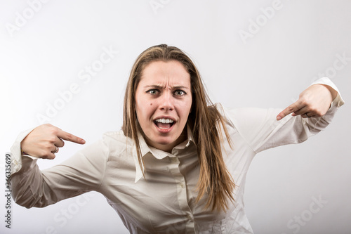 ragazza bionda con camicia bianca protesta vivacemente facendo dei gesti con le mani e delle espressioni di disapprovazione , isolata su sfondo bianco