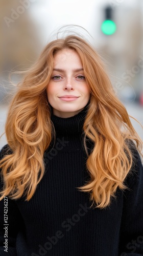 Random woman with long wavy hair wearing a black sweater standing outdoors on a cloudy day