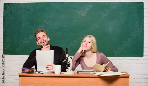Reading is my hobby. Home schooling. Modern school. Knowledge day. Couple of man and woman in classroom. Back to school. Student life. Lesson and blackboard. Teachers day