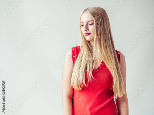 Red dress woman with blonde long hair and beauty red lipstick