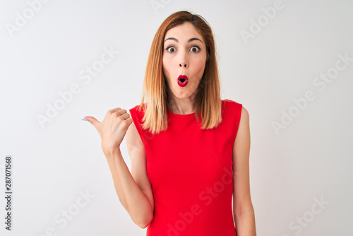 Redhead businesswoman wearing elegant red dress standing over isolated white background Surprised pointing with hand finger to the side, open mouth amazed expression.