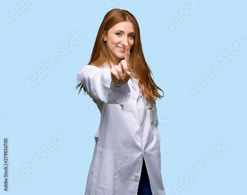 Redhead doctor woman showing and lifting a finger on isolated blue background